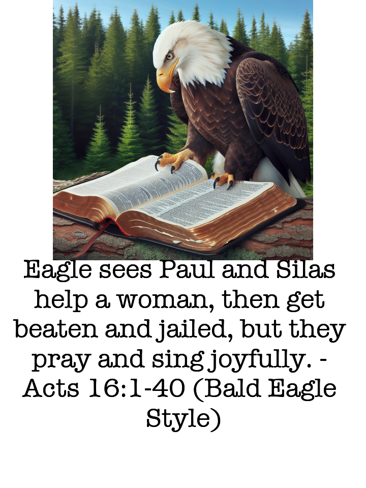 Eagle sees Paul and Silas help a woman, then get beaten and jailed, but they pray and sing joyfully.