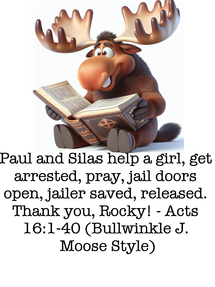 Paul and Silas help a girl, get arrested, pray, jail doors open, jailer saved, released. Thank you, Rocky!