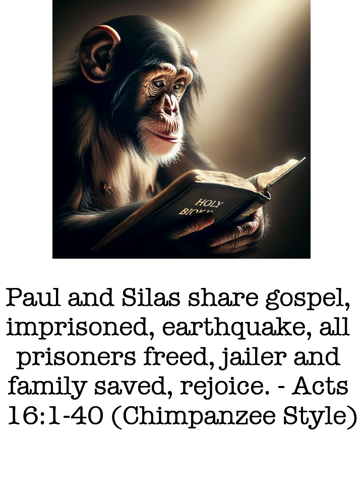Paul and Silas share gospel, imprisoned, earthquake, all prisoners freed, jailer and family saved, rejoice.