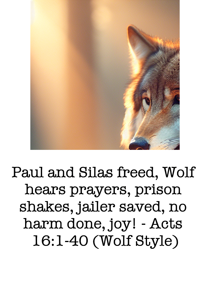 Paul and Silas freed, Wolf hears prayers, prison shakes, jailer saved, no harm done, joy!