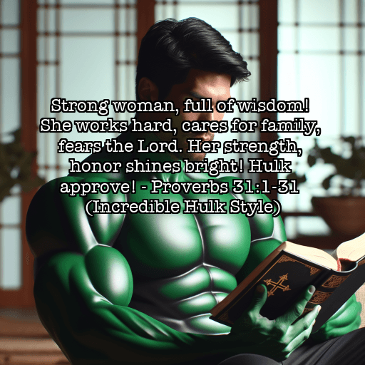 Strong woman, full of wisdom! She works hard, cares for family, fears the Lord. Her strength, honor shines bright! Hulk approve!