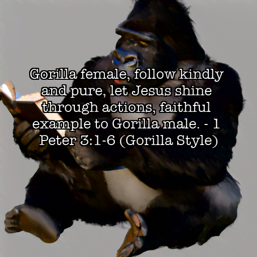 Gorilla female, follow kindly and pure, let Jesus shine through actions, faithful example to Gorilla male.