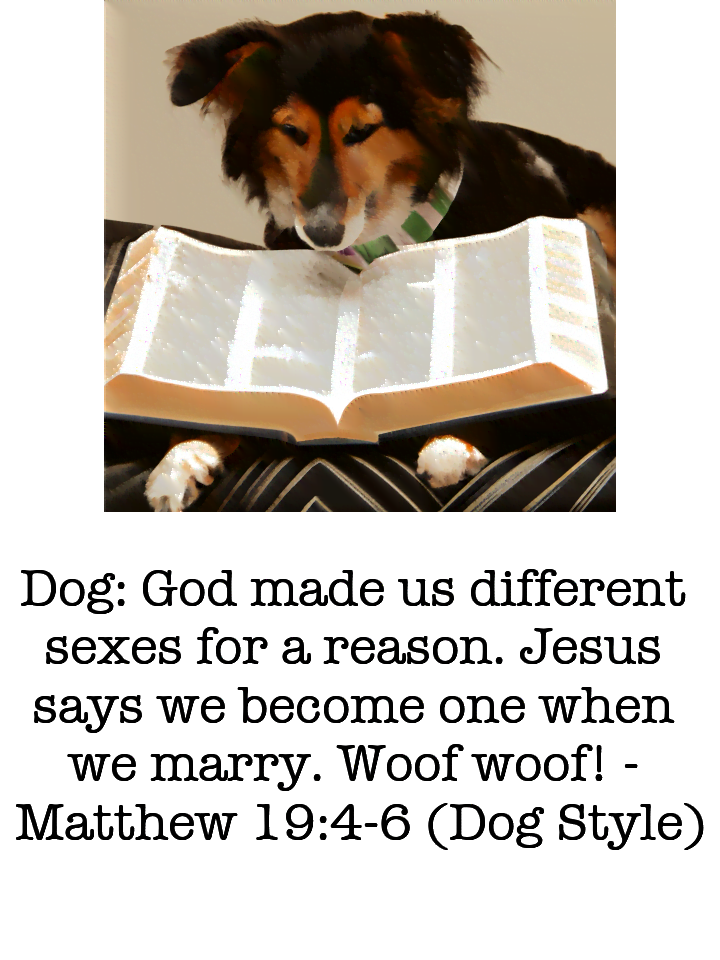 Dog: God made us different sexes for a reason. Jesus says we become one when we marry. Woof woof!
