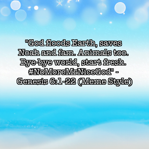 “God floods Earth, saves Noah and fam. Animals too. Bye-bye world, start fresh. #NoMoreMrNiceGod”